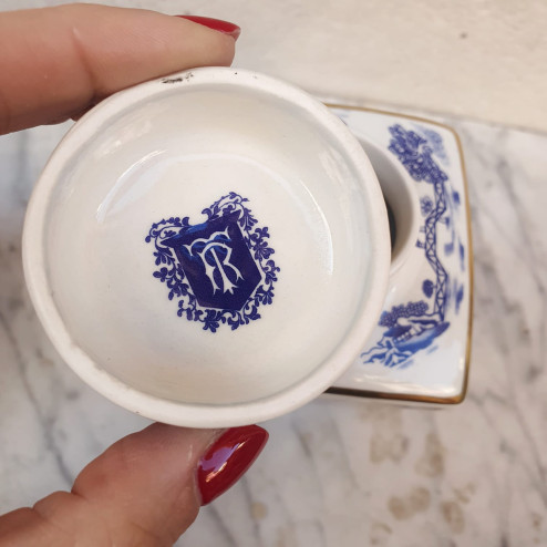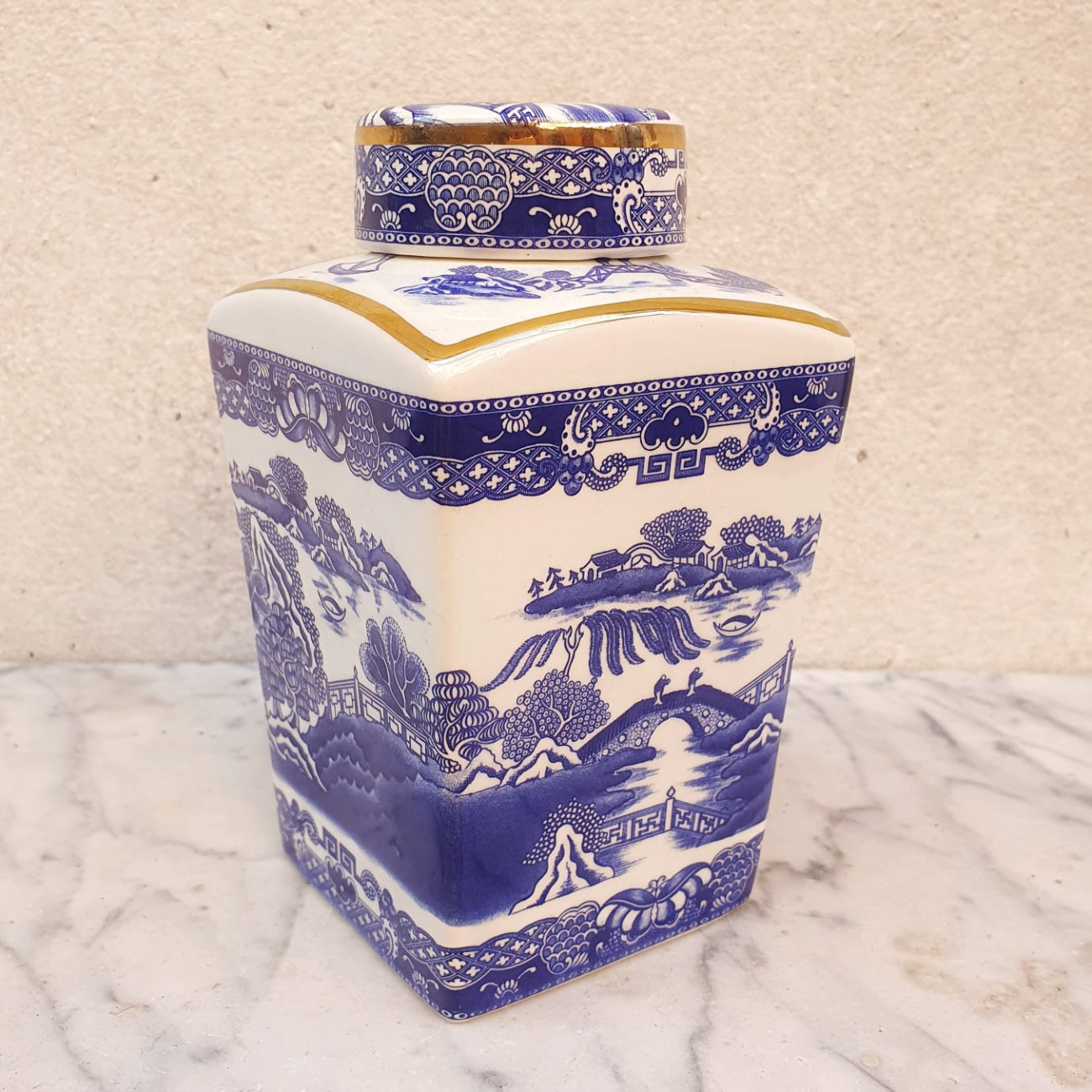 Il barattolo è decorato in un bel blu cobalto dal pattern willow, mentre i profili del coperchio e del bordo superiore sono decorati dal filo oro.