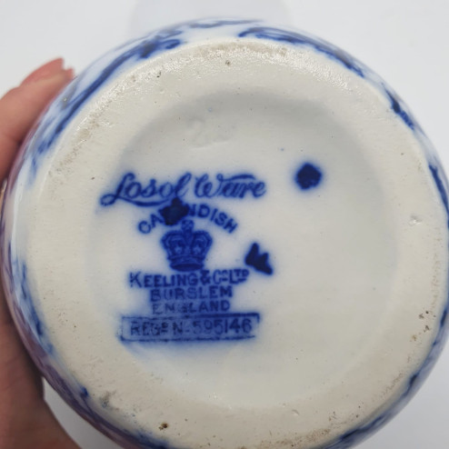 Il vaso è interamente ricoperto da un ricco disegno floreale in un bel blu cobalto: dal marchio sul fondo si può notare che il pattern Cavendish è stato registrato nel 1912.