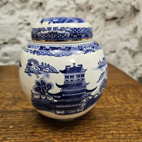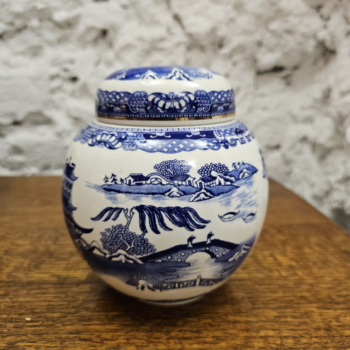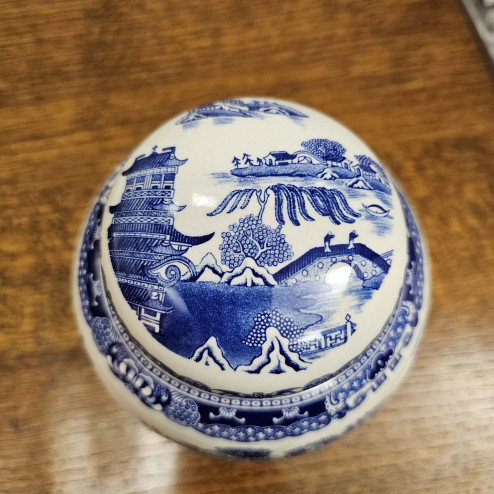Il motivo Willow, ispirato all’estetica orientale, raffigura paesaggi con padiglioni, ponti e alberi stilizzati, resi con ricca cura dei dettagli. Il coperchio è abbinato e presenta lo stesso decoro, con una graziosa farfalla come elemento decorativo principale sul bordo superiore.