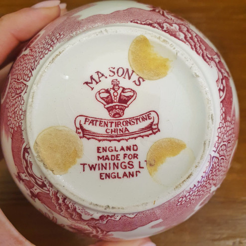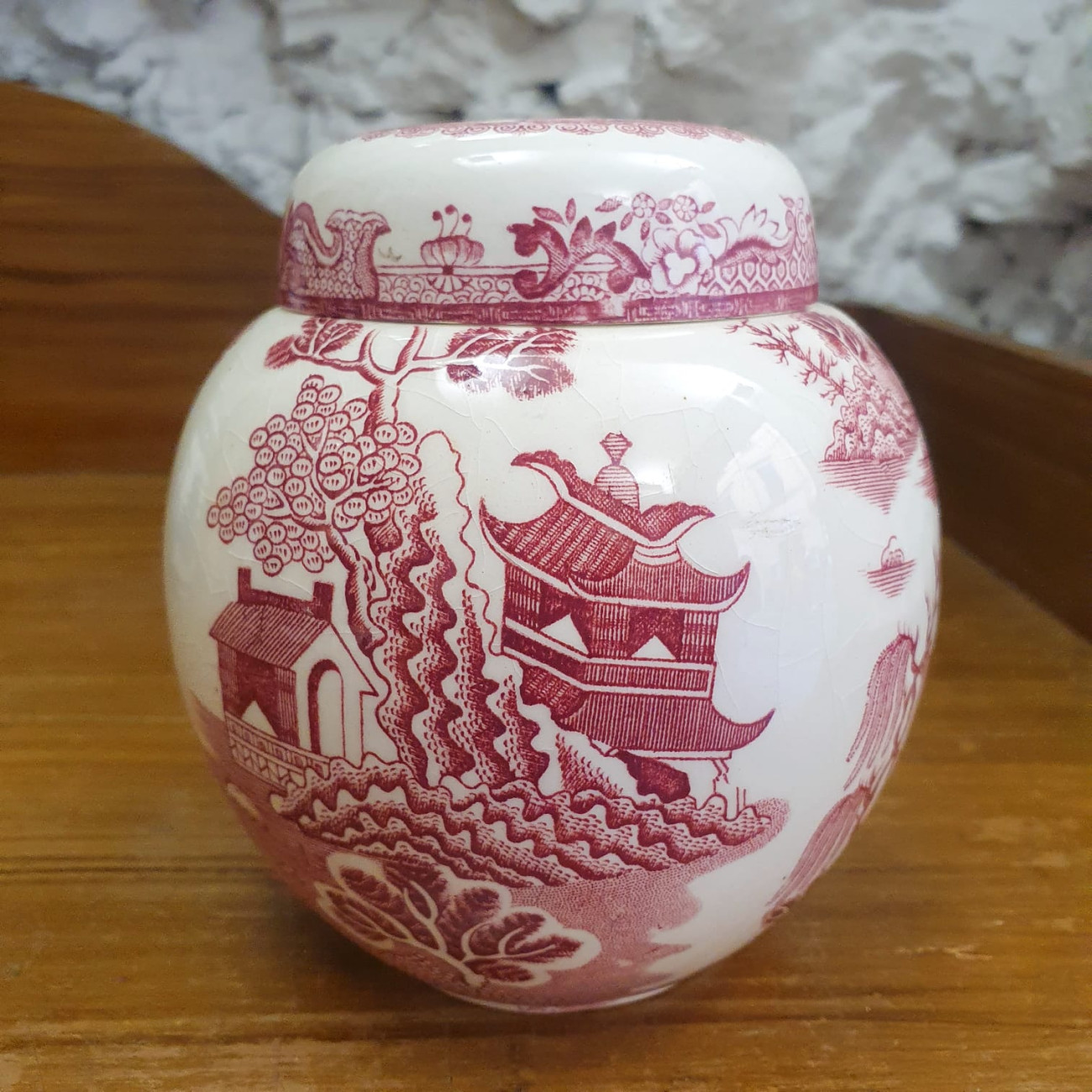 Tea caddy da collezione prodotto da Mason’s per Twinings negli anni ’40, in ceramica smaltata con decoro "Willow pattern" in rosso, variante meno comune rispetto al classico blu.