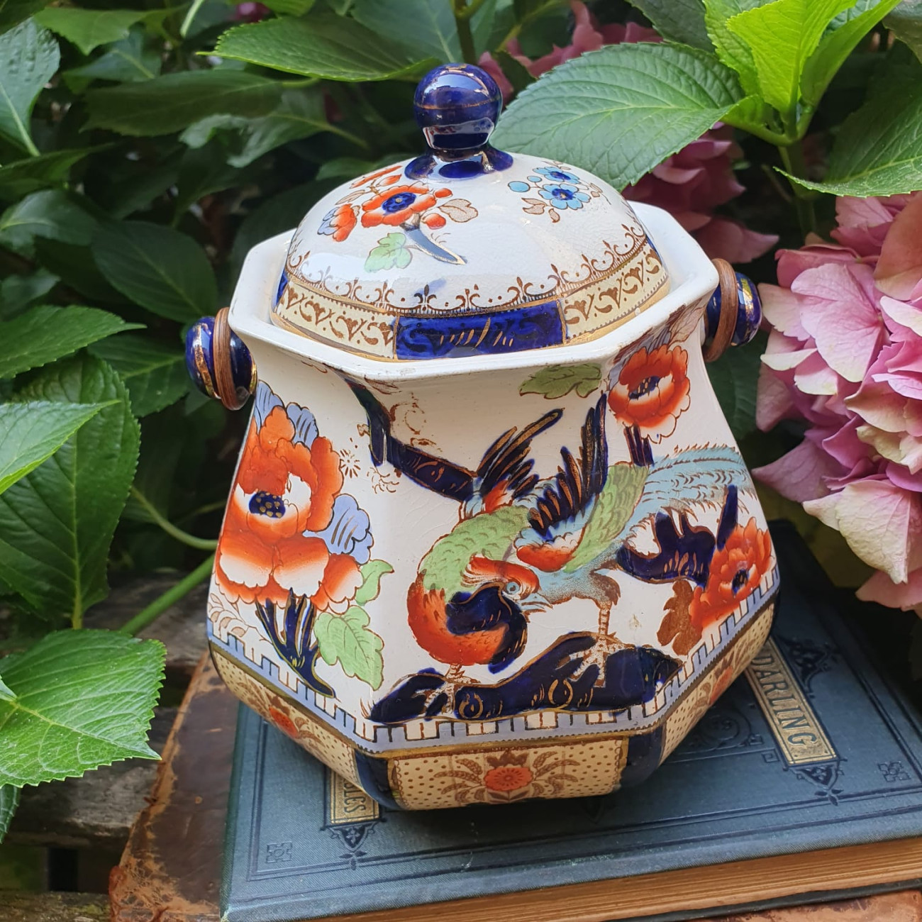 Biscottiera in ceramica inglese decorata in stile orientale, con elegante forma ottagonale e manico in rattan. Attribuita a Keeling & Co., produzione Losolware (1912–1936), decoro Shanghai in variante rossa.
