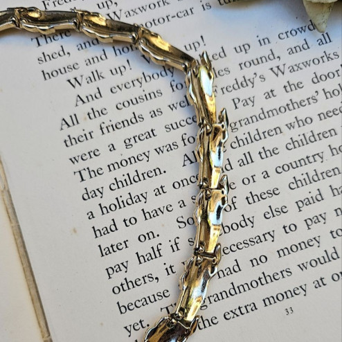 Collana girocollo Trifari anni ’60 in lega metallica dorata, con elementi a foglioline satinate e lucide. Firma Trifari con key originale e chiusura regolabile. Alcuni segni del tempo.