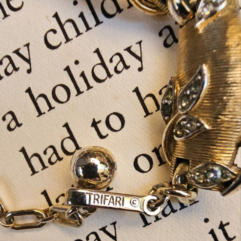 La chiusura, regolabile in lunghezza, reca la firma Trifari, garanzia della qualità e dell’eleganza design tipica del marchio.