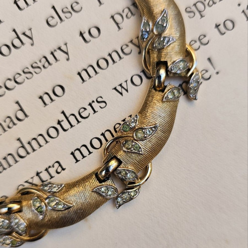 Elegante collana girocollo Trifari anni ’50, in lega metallica dorata con segmenti rigati e tralci decorativi con strass trasparenti e color verde chiaro. Firma sul fermaglio, lunghezza regolabile.