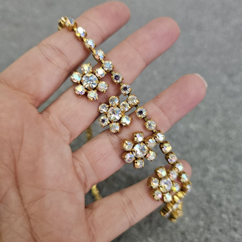 Il motivo centrale è composto da una serie di delicate margherite pendenti, ciascuna costruita con piccoli rhinestones sfaccettati che catturano la luce a ogni movimento. La parte superiore è formata da un’unica fila di strass, luminosa e regolare, che si adagia con eleganza sul collo.