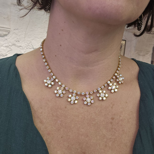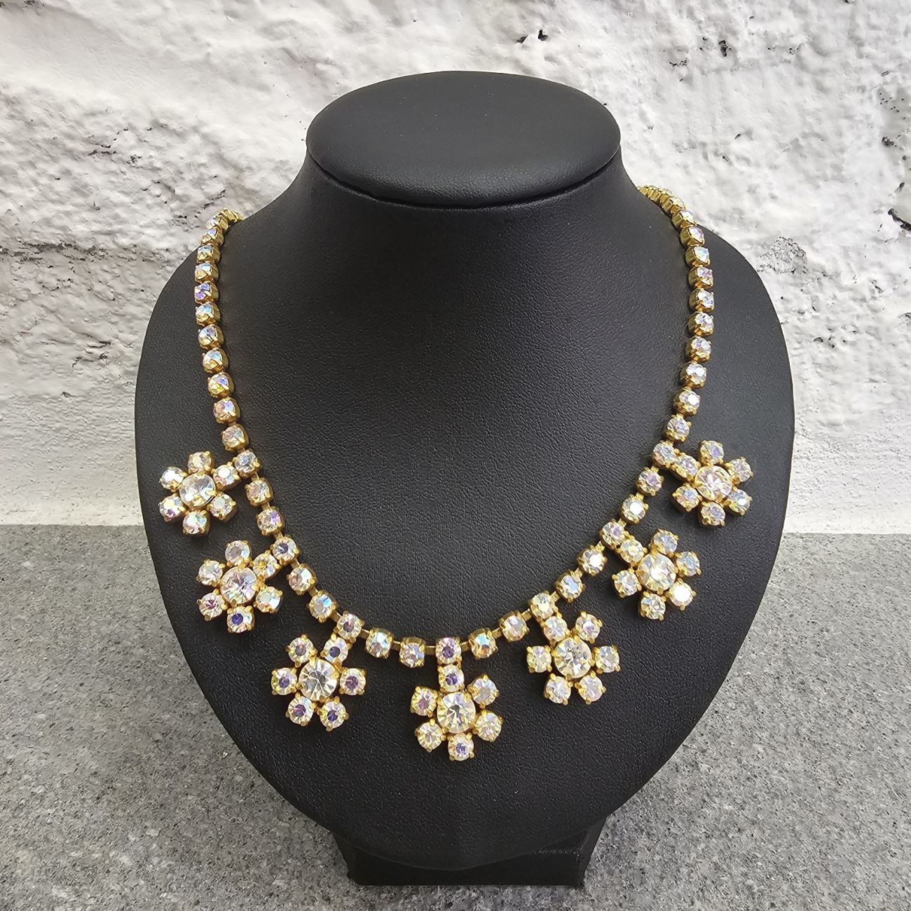 Splendida collana vintage inglese risalente agli anni ’30-40, realizzata in metallo dorato e decorata con una ricca fila di strass Aurora Borealis, la celebre finitura introdotta negli anni ’50 ma già utilizzata in forme sperimentali dalla fine degli anni ’30, nota per i suoi incredibili riflessi iridescenti.