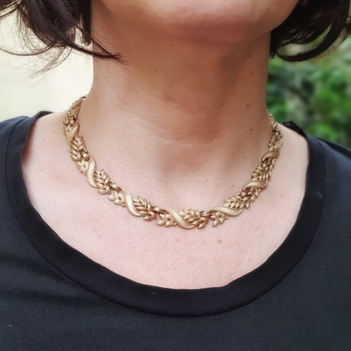 La collana, in lega metallica dorata Trifarium, è composta da una serie di elementi satinati a forma di foglie e nastri, collegati tra loro da fascette lucide, che creano un bellissimo effetto di movimento.