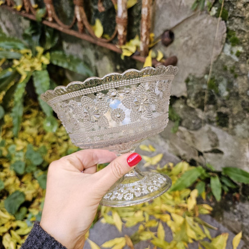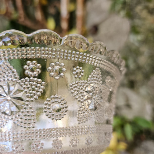 La forma è quella classica a coppa su piede, pensata per il servizio da tavola, con una presenza elegante e ben proporzionata. Il corpo è decorato da un ricco motivo a rilievo composto da rosette, perlinature e piccoli elementi geometrici che catturano e riflettono la luce in modo delicato. Il bordo è leggermente mosso, mentre il piede, anch’esso decorato, conferisce stabilità e continuità stilistica all’insieme.