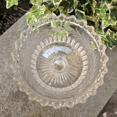 Coppetta inglese in vetro pressato prodotta alla fine dell’Ottocento in epoca vittoriana. Presenta una fascia centrale liscia decorata con un elegante motivo molato stilizzato a foglie. Ottime condizioni. Diametro 13,5 cm, altezza 11,5 cm.
