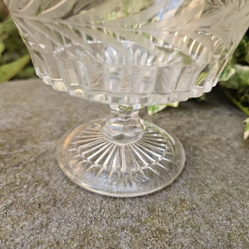 La forma è slanciata e armoniosa, con coppa leggermente svasata sostenuta da un piede lavorato. Il vetro presenta diverse lavorazioni che creano un raffinato gioco di luci: la parte inferiore è decorata con motivi geometrici tipici del vetro pressato ottocentesco, mentre il bordo superiore è rifinito con un delicato profilo ondulato.