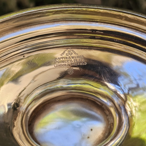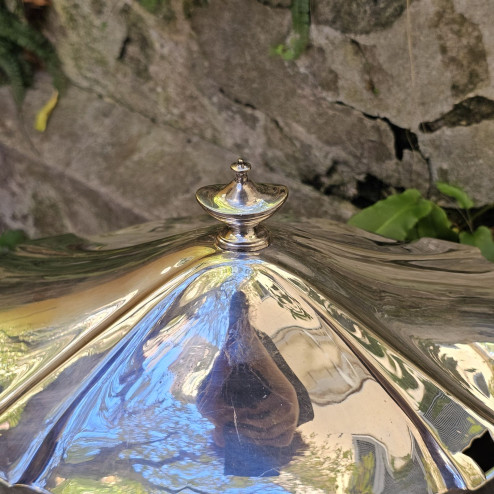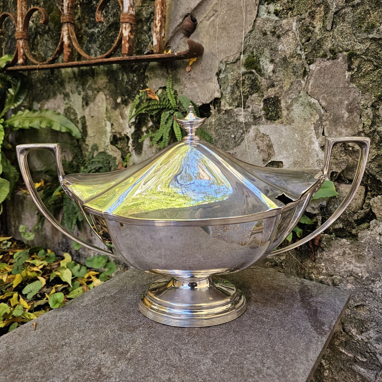 Magnifica zuppiera ovale in Sheffield Plate inglese, prodotta intorno al 1890 dalla prestigiosa Mappin & Webb, una delle più celebri argenterie britanniche di epoca vittoriana.