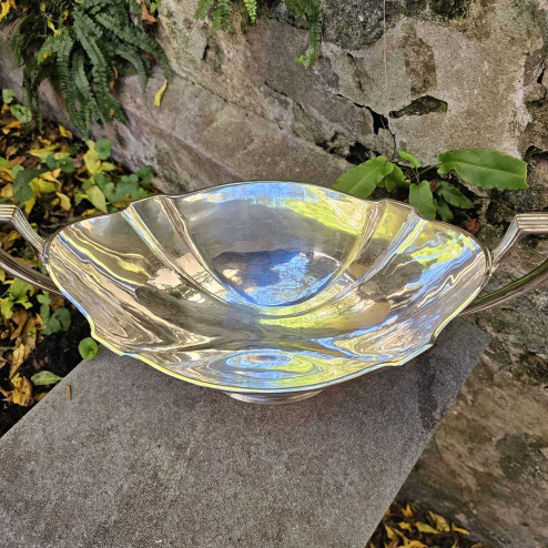 Il corpo ovale è liscio e luminoso, sostenuto da un piede centrale tornito che conferisce stabilità e slancio alla forma complessiva. Un pezzo imponente e altamente decorativo, perfetto come zuppiera da servizio o come oggetto protagonista di un allestimento da tavola o di un centrotavola.