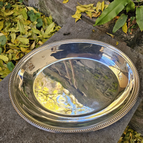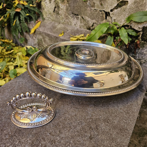Legumiera ovale in sheffield plate prodotta in Inghilterra negli anni ’30, con manico removibile e bordo decorato a sferette. Utilizzabile anche come doppio vassoio. Buone condizioni generali.