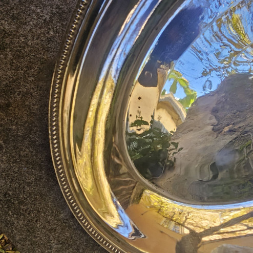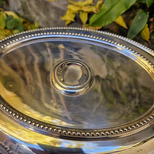Il corpo presenta un bordo finemente decorato a piccole sferette, motivo classico molto apprezzato nell’argenteria inglese dell’epoca, ripreso anche nel manico superiore, anch’esso ornato con lo stesso motivo. Il manico è removibile e può essere facilmente staccato, permettendo così di utilizzare l’oggetto anche come doppio vassoio ovale da portata.
