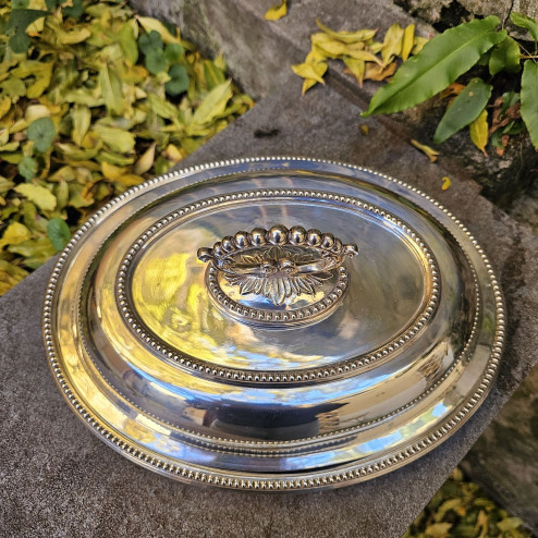 Elegante legumiera inglese in sheffield plate risalente agli anni Trenta del Novecento, caratterizzata da una raffinata forma ovale e da un disegno sobrio ed equilibrato tipico della produzione britannica del periodo tra le due guerre.