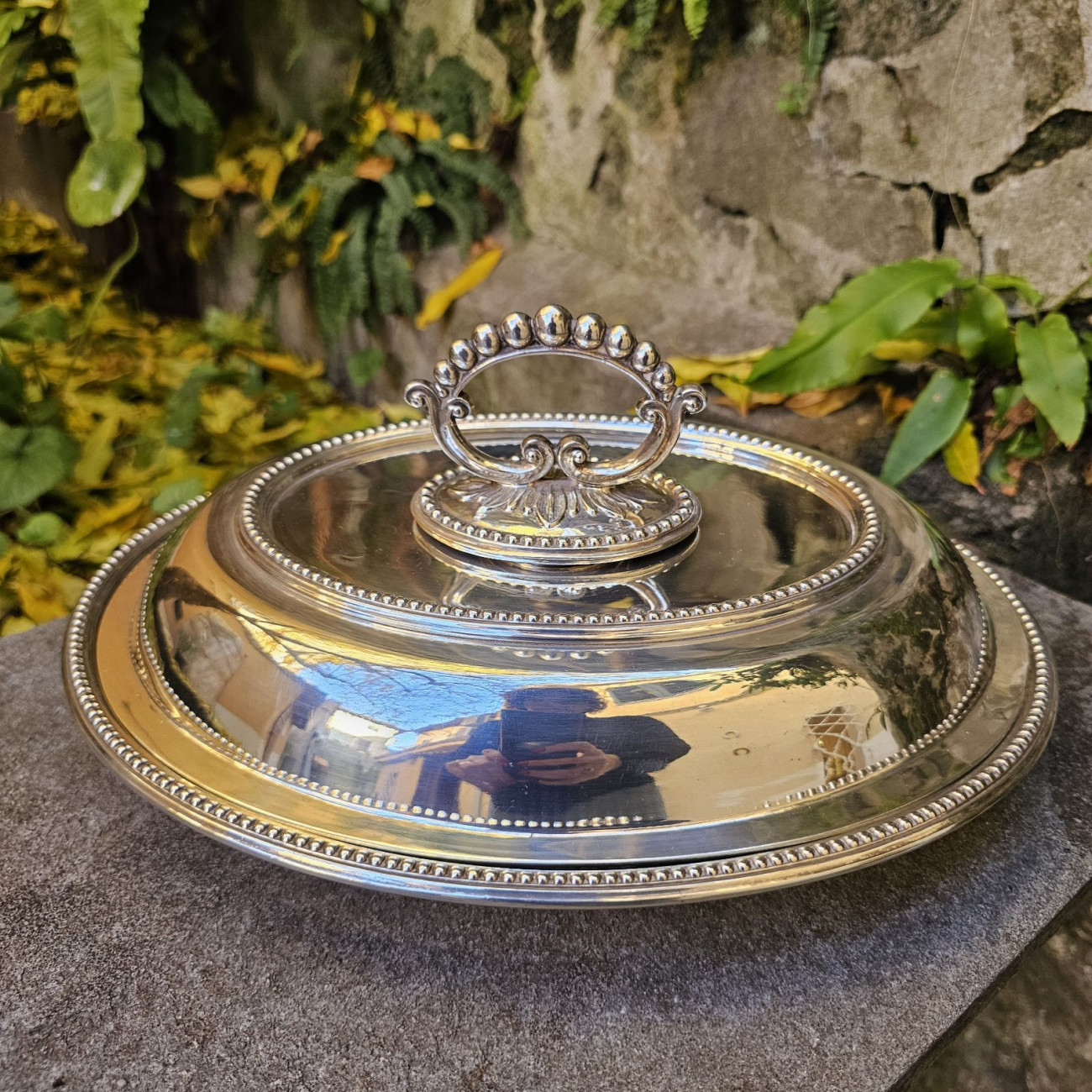 La legumiera si presenta in buone condizioni generali. Sono presenti alcuni piccoli puntini tipici dello sheffield plate e un lieve difetto di chiusura, visibile in fotografia, che non compromette in alcun modo l’utilizzo dell’oggetto né la sua stabilità.