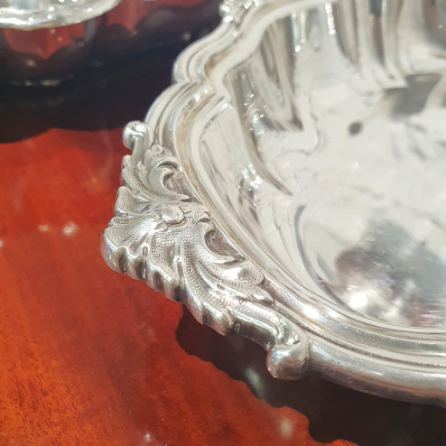 Dalle forme morbide e sontuose, il metallo luminoso è riccamente decorato sui bordi da riccioli e volute, sia esternamente che internamente.
