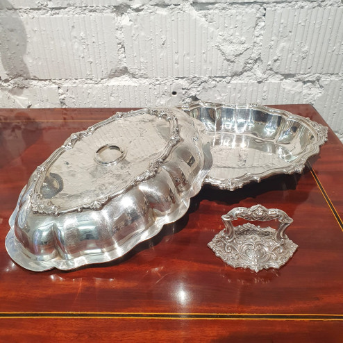 Spettacolare legumiera in sheffield plate con manico removibile prodotta nel 1910-1920 circa da J. Dixon.