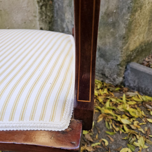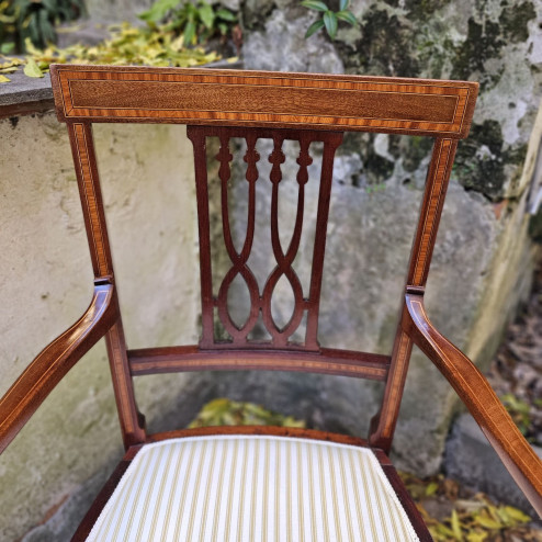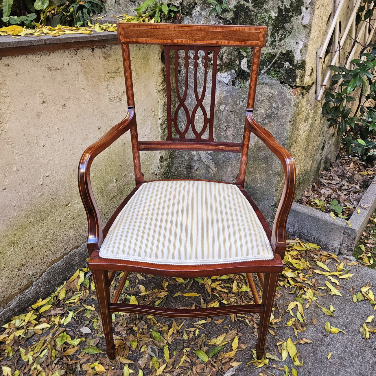Elegante sedia inglese edoardiana con braccioli, realizzata in mogano con raffinati intarsi lineari a contrasto. Schienale traforato di gusto neoclassico e seduta imbottita. Inghilterra, primi anni del Novecento.