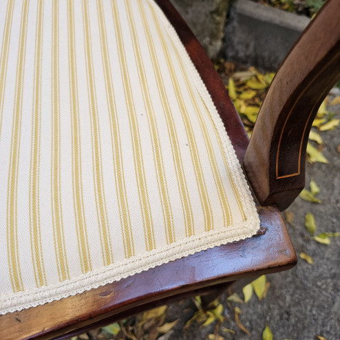 I braccioli elegantemente sagomati seguono una linea continua e armoniosa, conferendo leggerezza visiva all’insieme. La seduta imbottita è stata rifoderata in tessuto chiaro a righe sottili, scelto in modo coerente con lo stile e il periodo del mobile.