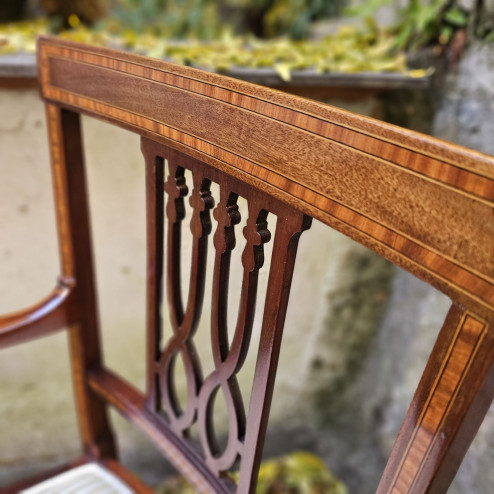 La struttura è in mogano, arricchita da raffinate impiallacciature e filettature lineari a contrasto, che sottolineano con discrezione la cresta superiore, i montanti e i braccioli. Lo schienale presenta un pannello centrale traforato con motivo ad ovali intrecciati, tipico del repertorio decorativo neoclassico e particolarmente apprezzato nella produzione edoardiana di qualità.