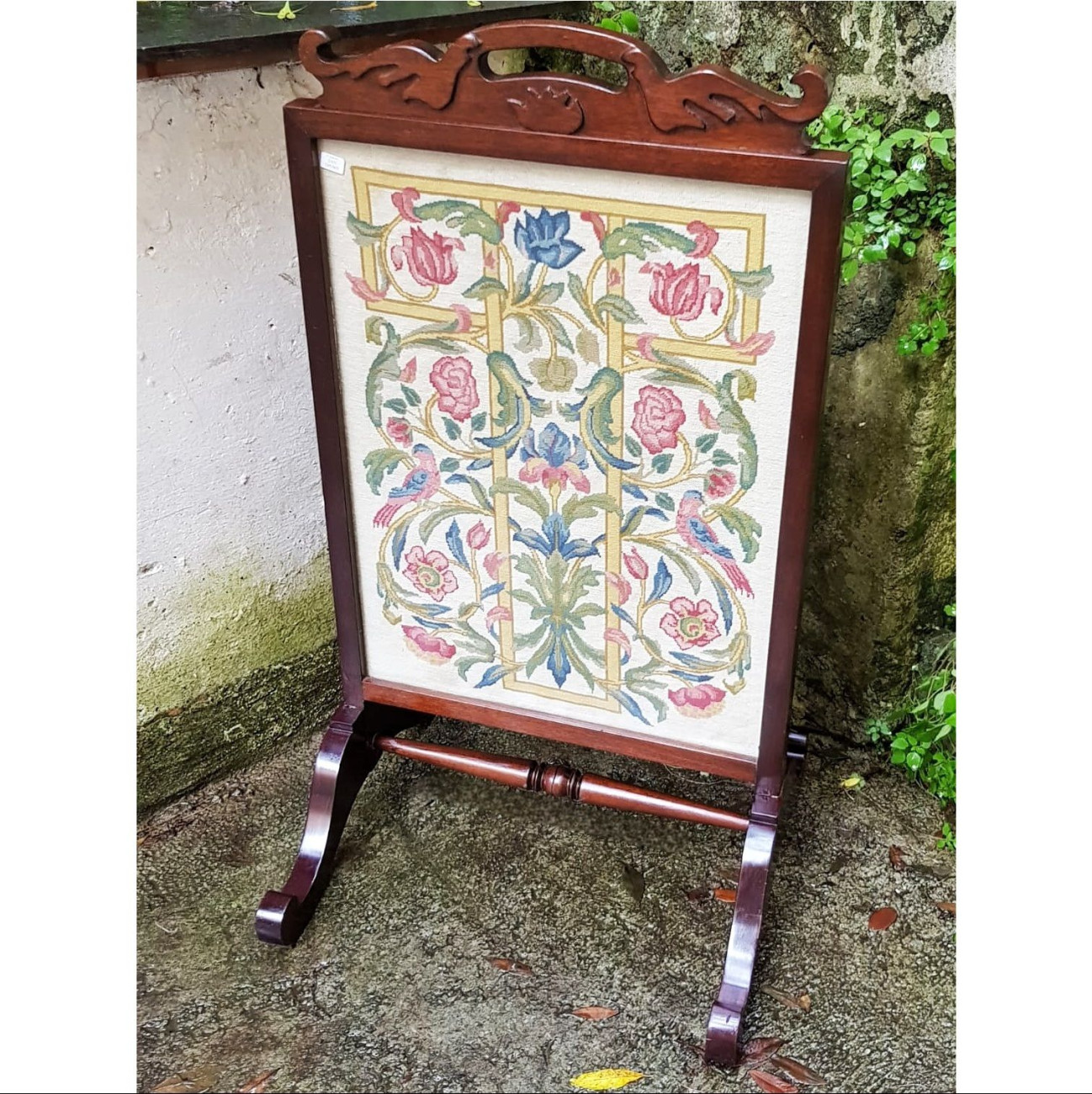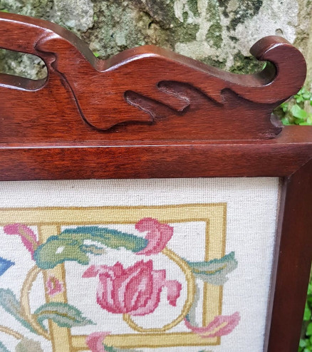 Fire screen o paracamino tardo vittoriano (fine Ottocento) in mogano, con pannello centrale originale ricamato a piccolo punto.