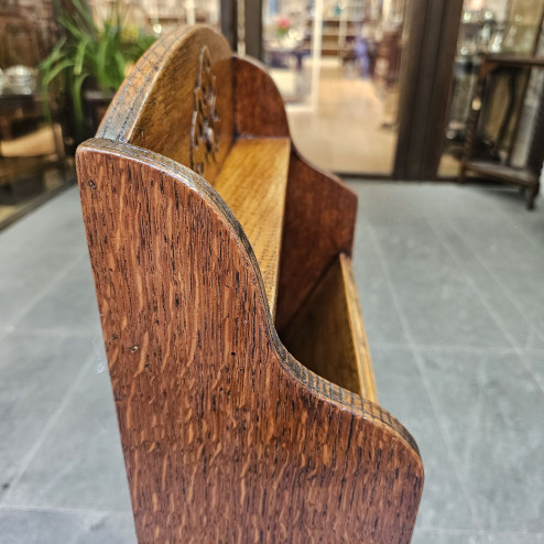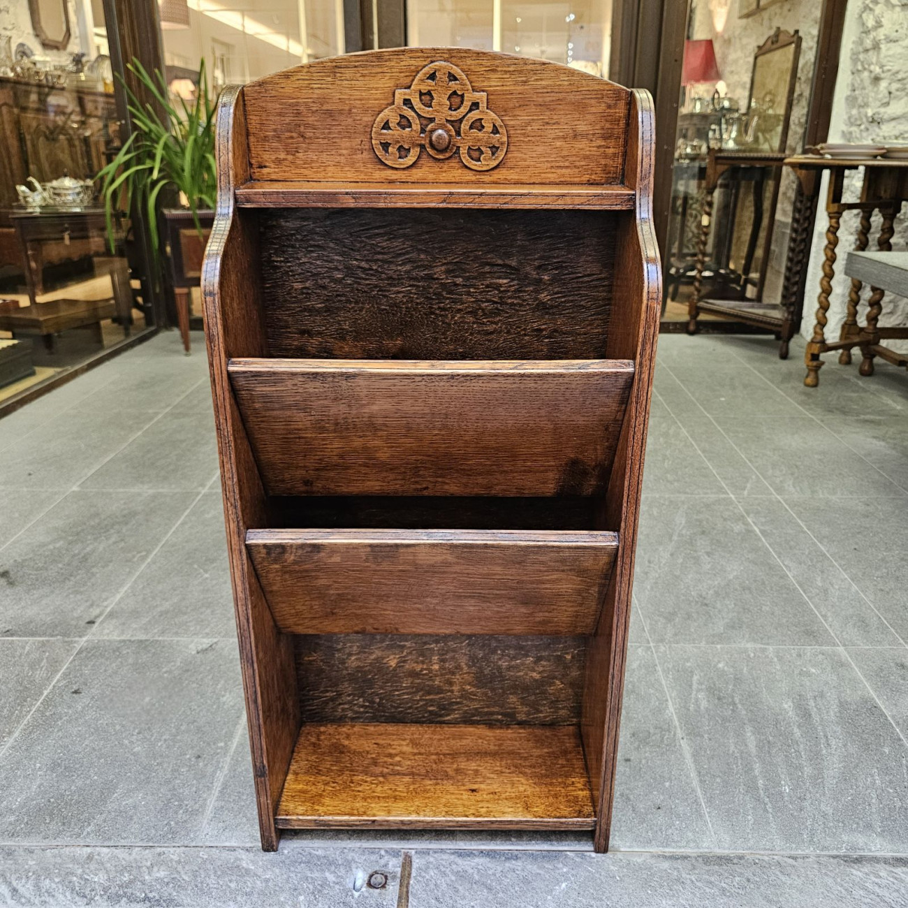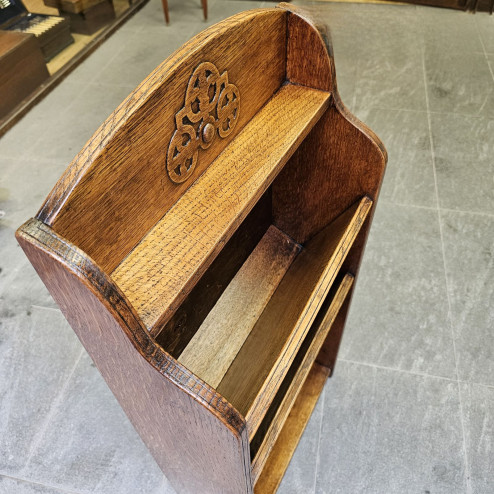 Elegante porta riviste inglese in rovere, periodo fine Ottocento / inizi Novecento, stile Arts & Crafts. Intagli decorativi originali, restaurato e in ottime condizioni.