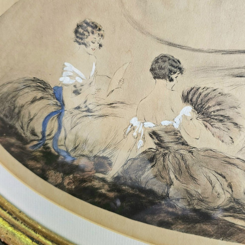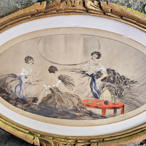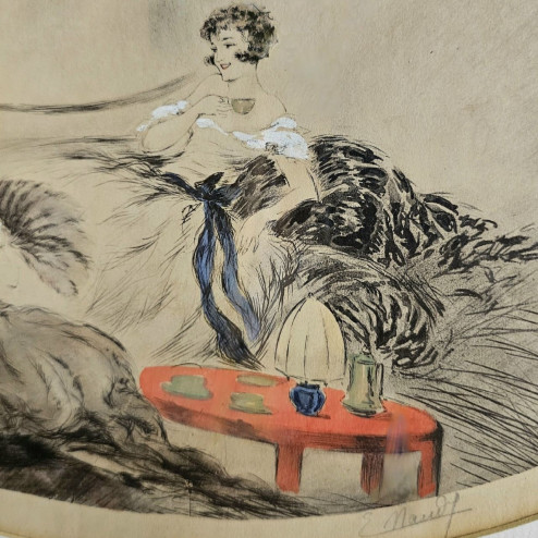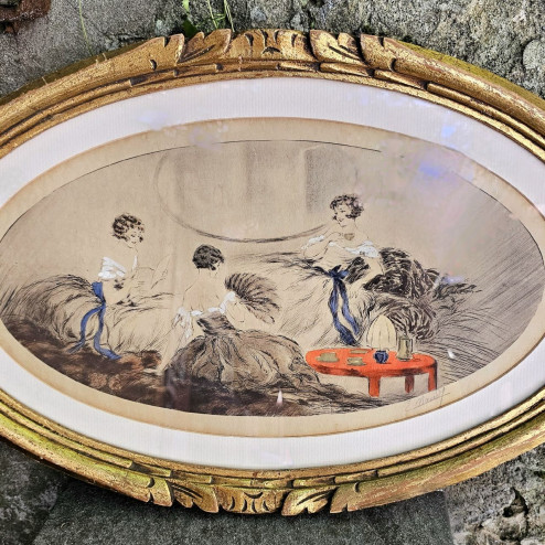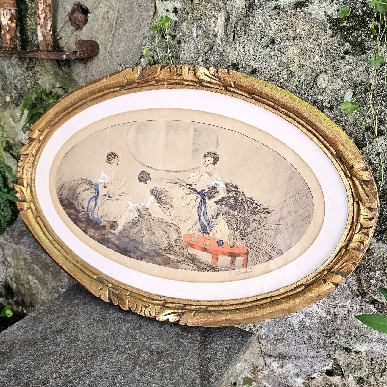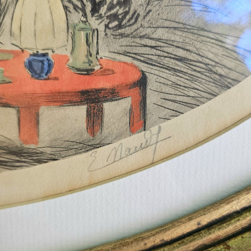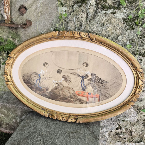 Litografia francese dei primi del Novecento, firmata con lo pseudonimo E. Naudy (Alfred Renaudin). Colorata a mano, custodita nella cornice originale dorata in stile déco.