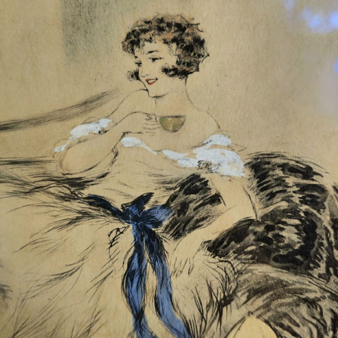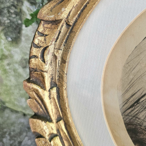 Il tratto fluido e i dettagli delicati trovano ulteriore risalto nei tocchi di colore, applicati manualmente, che donano profondità e vivacità all’opera. La cornice originale, dorata e finemente lavorata, completa il quadro con un accento di pregio, valorizzandolo come autentico oggetto d’arte e arredo.