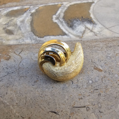 Grande spilla in bigiotteria americana, firmata dalla famosa ditta Trifari, risalente agli anni cinquanta. Due rami si intrecciano a formare una corona, con un bell'effetto tridimensionale. La doratura è in ottime condizioni, e gioca con il lucido dei rami e delle nervature delle foglie, con il satinato delle stesse, creando un effetto molto raffinato.