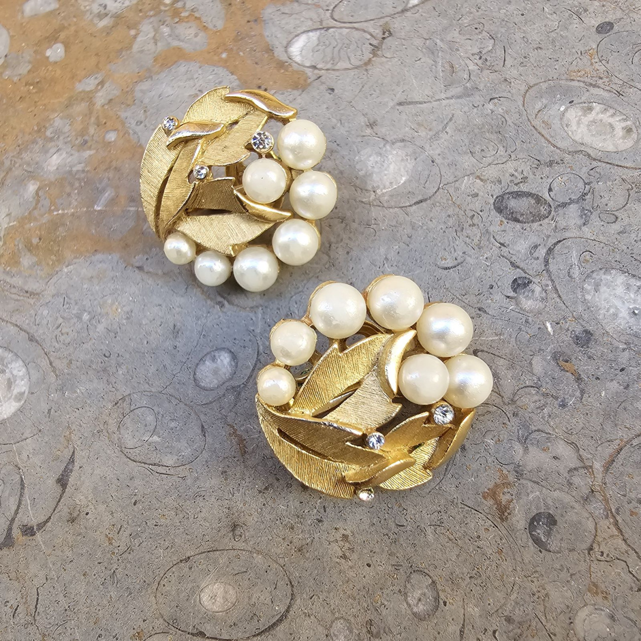 Questa coppia di orecchini a clip degli anni '60 è la quintessenza dello stile inconfondibile di Trifari: la lucente lega metallica dorata dal colore caldo, con doppia lavorazione lucida e satinata, e le faux pearls, talmente fatte bene da sembrare vere, rendono questi orecchini un piccolo capolavoro di eleganza. Piccoli strassa trasparenti inoltre illuminano il tutto.