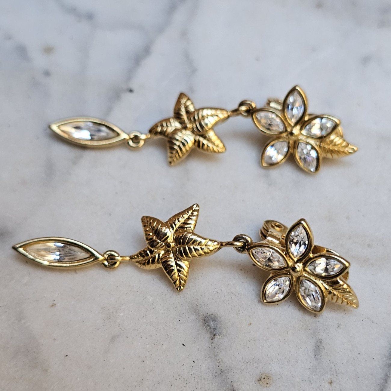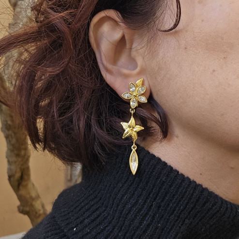 Gli orecchini sono realizzati in lega metallica color dorato e presentano una composizione articolata a più elementi: una parte superiore a fiore con petali decorati da strass trasparenti, un elemento centrale a stella marina finemente lavorata e una goccia finale con strass incastonato. L’insieme crea un movimento leggero e una notevole luminosità, valorizzando il viso con discreta eleganza.