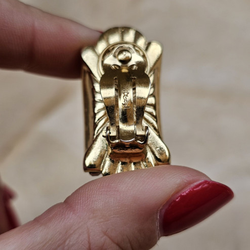 Il retro è finemente lavorato, con chiusura a clip robusta, e reca il logo YSL inciso, ben visibile e presente su entrambi gli orecchini, a conferma dell’autenticità del pezzo.