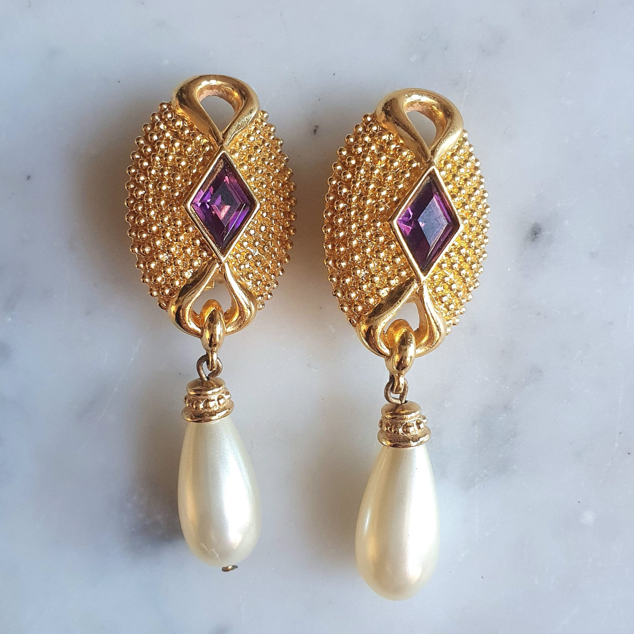 Gli orecchini, caratterizzati da una grande faux pearl pendente, sono in una lega metallica dorata molto luminosa lavorata a piccole sfere. Al centro della montatura è incastonato un bel cristallo taglio romboidale color ametista.