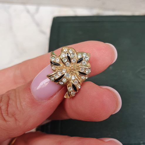 In lega metallica dorata a forma di coccardina, sono impreziositi da strass trasparenti e tocchi di smalto nero.