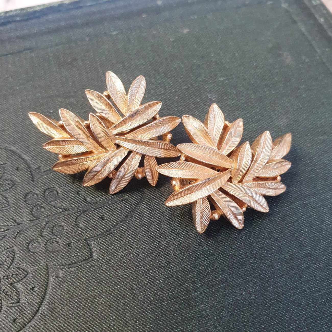 Eleganti orecchini vintage Trifari anni ’60 in metallo dorato satinato, composti da fogliette stilizzate finemente lavorate.