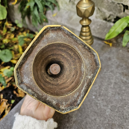 L’ottone presenta una patina d’epoca calda e uniforme, che valorizza la superficie e aggiunge profondità al modellato.