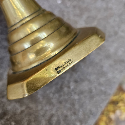 Elegante coppia di candelieri inglesi in ottone, databili alla fine del XIX secolo e caratterizzati dal numero di registro del 1893 impresso sulla base, tipico delle registrazioni britanniche dell’epoca.