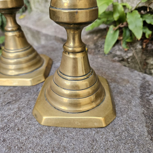 Coppia di candelieri inglesi in ottone del XIX secolo, altezza 27 cm, con meccanismo originale a stantuffo e numero di registro del 1893. Bel peso e patina autentica.