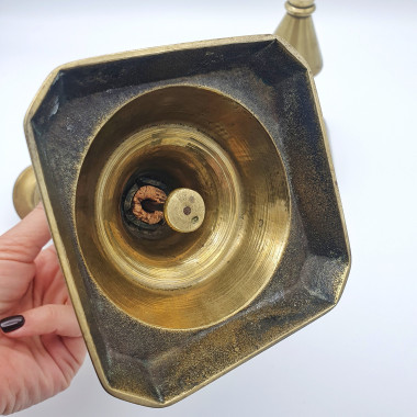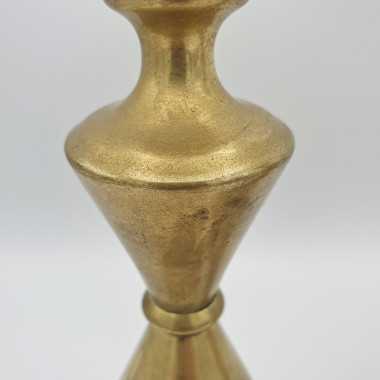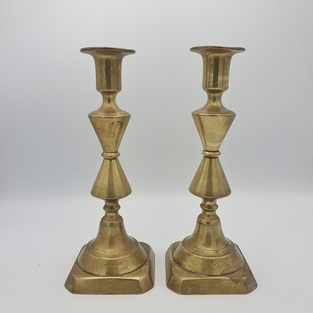 Stilosi candelieri inglesi in ottone, dalla forma geometrica e particolarmente accattivante, prodotti alla metà del XIX secolo, in piena epoca vittoriana.