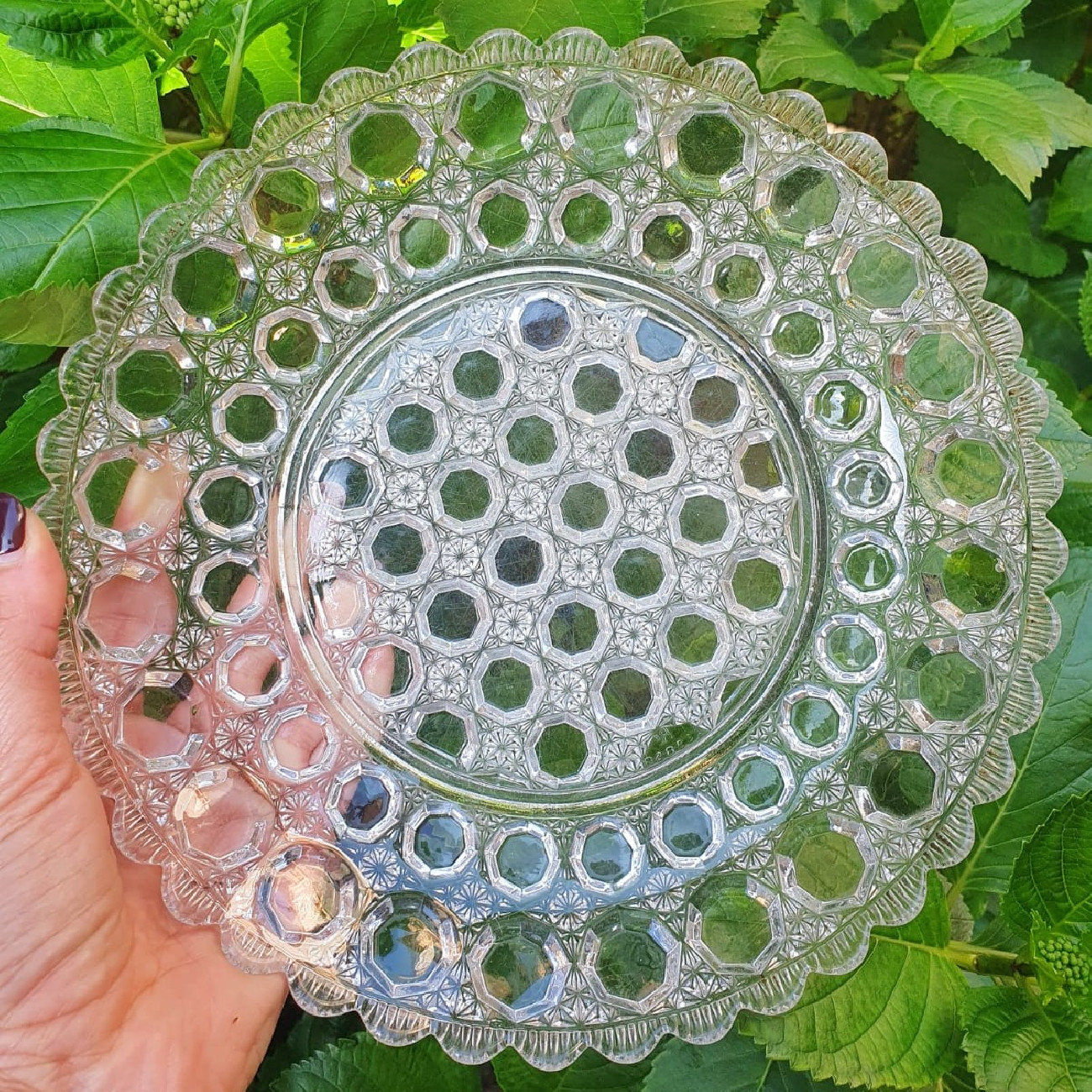 Ampia coppa dai bordi bassi (quasi un piatto) in vetro pressato inglese risalente alla fine dell'Ottocento.