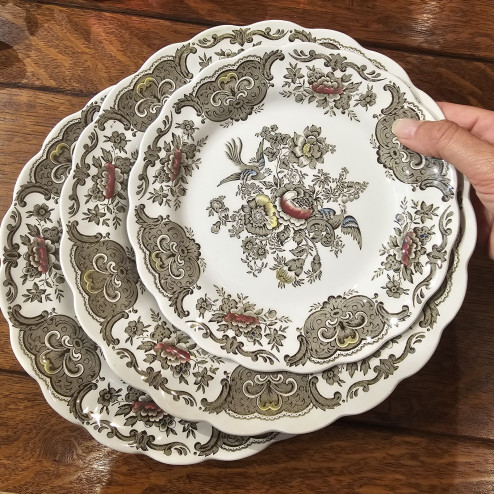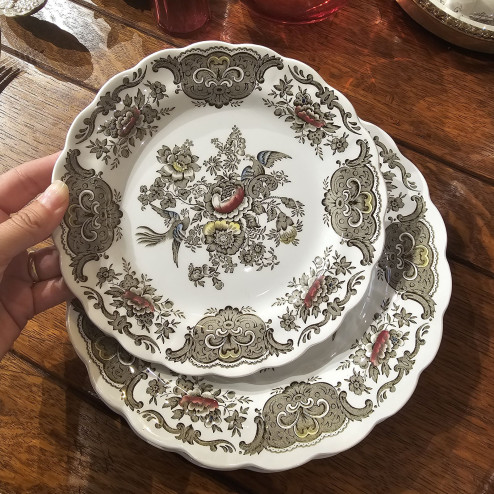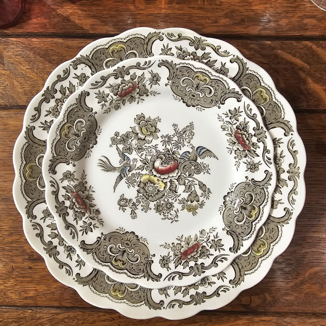 Questo raffinato posto tavola è composto da tre piatti originali prodotti da Ridgway England negli anni ’60, parte del celebre pattern “Windsor”, molto apprezzato per il suo decoro floreale con dettagli in toni tenui e volatili stilizzati.