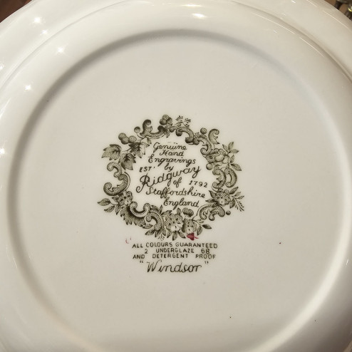 Il decoro venne introdotto intorno agli anni ’50 e continuò a essere prodotto anche dopo la fusione di Ridgway nel gruppo Lawley e la successiva acquisizione da parte di Royal Doulton, che mantenne in produzione la linea “Ridgways Windsor” fino almeno al 1982.