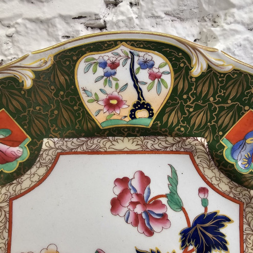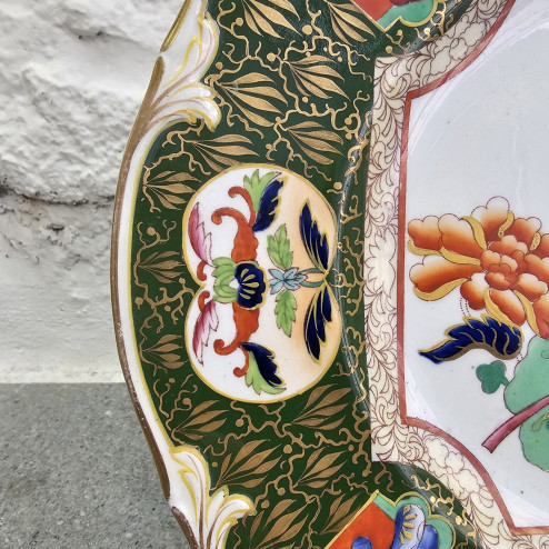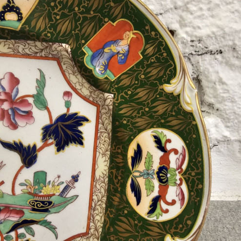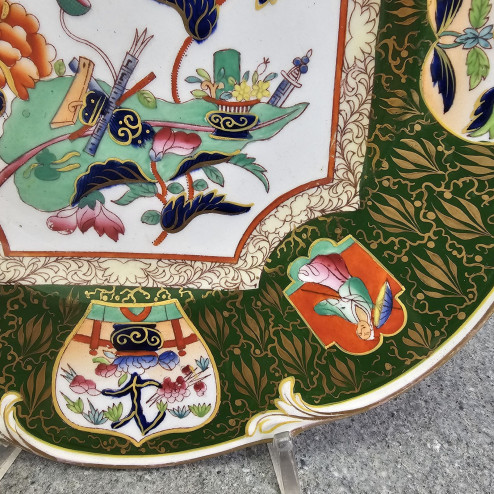 Raffinato piatto in ceramica inglese Ironstone, prodotto da G.L. Ashworth & Bros nella seconda metà dell'Ottocento. Decorazione di ispirazione orientale con un raro bordo verde bosco impreziosito da arabeschi in oro zecchino stesi a mano. Un pezzo da collezione che unisce la robustezza della ceramica inglese alla delicatezza del decoro manuale.