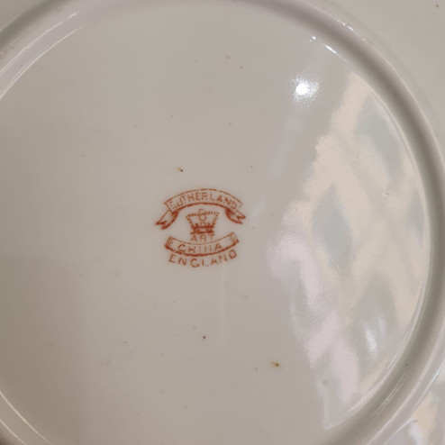 Delizioso piatto da pane e burro o da dessert in porcellana inglese, prodotto dalla manifattura William Hudson sotto il marchio Sutherland China tra il 1912 e il 1941.