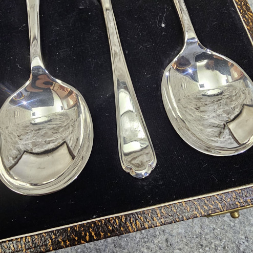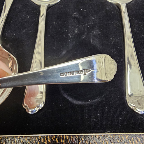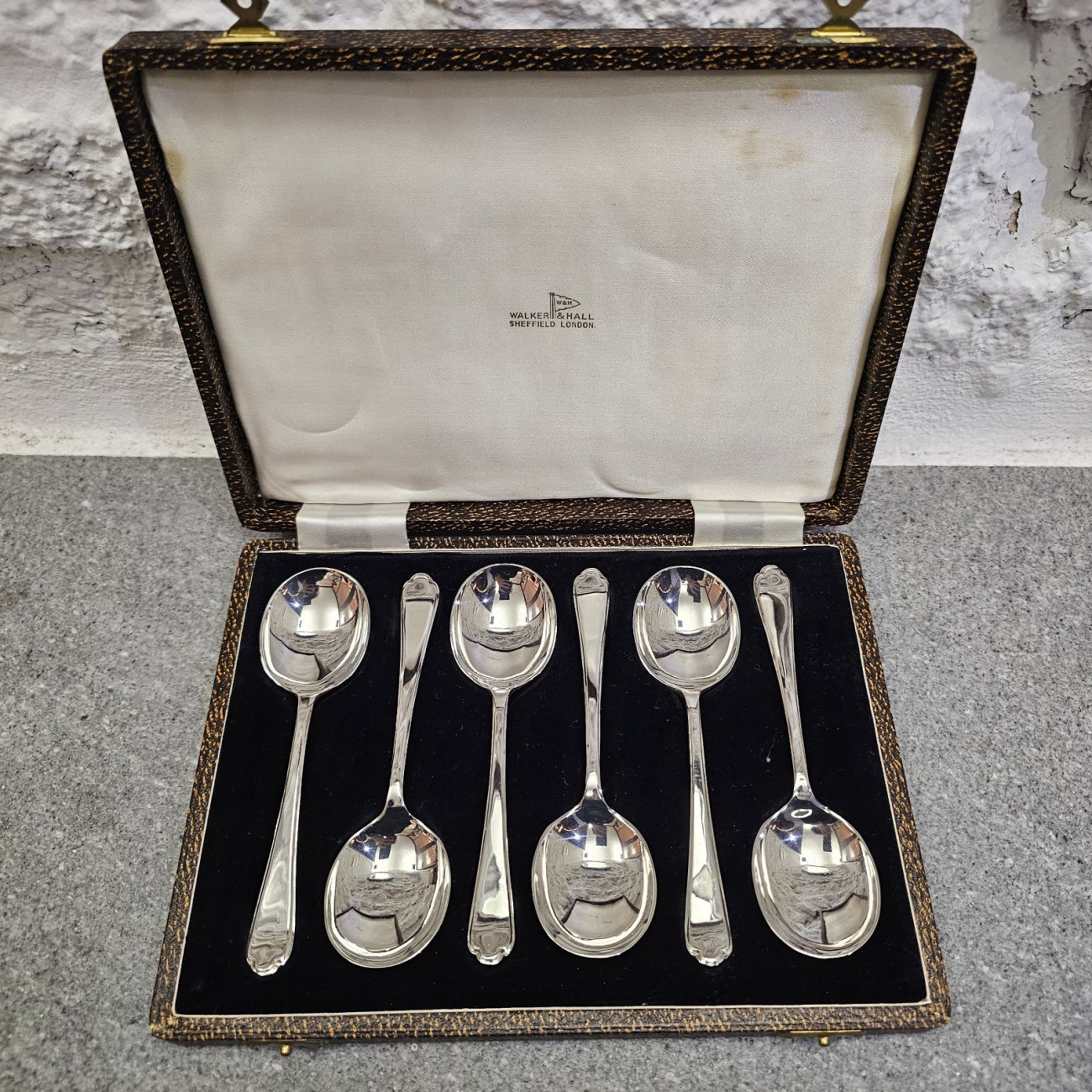 Set 6 cucchiai da dessert in Sheffield plate Walker & Hall, con scatola (1910–1920)