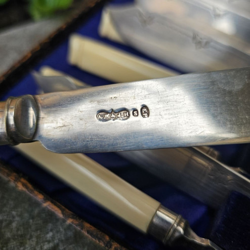 Le lame e i rebbi sono realizzati in Sheffield plate — la tecnica tipicamente inglese che prevede la laminazione dell'argento su metallo base, garanzia di qualità e prestigio — e presentano incisioni decorative con motivi floreali e vegetali sulla lama, in puro stile edoardiano/Art Déco. Il punzone visibile sul coltello riporta le iniziali A.W. & J.H., riferibili a un produttore della tradizione orafa e posateria di Sheffield.