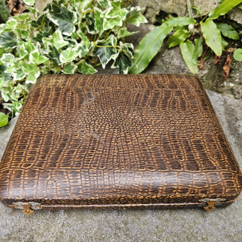 L'astuccio è rivestito esternamente in similpelle goffrata a motivo coccodrillo color marrone scuro, con angoli rinforzati in ottone. L'interno è foderato in velluto blu royal con supporti sagomati per ogni singolo pezzo. La chiusura è a scatto metallico.