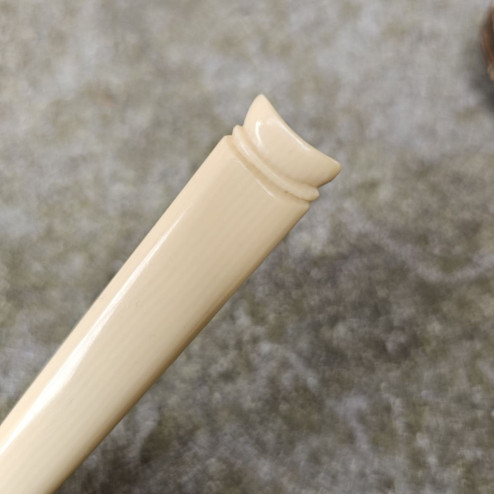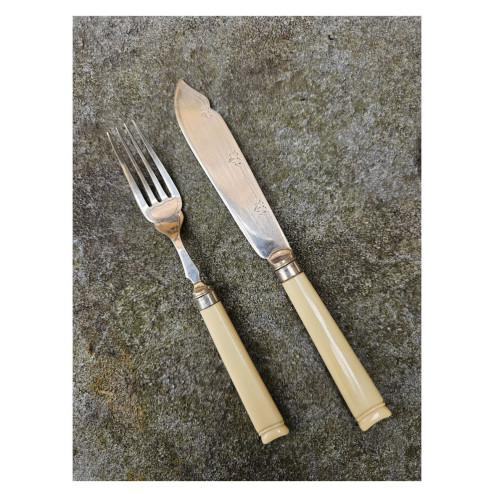 I manici sono in bachelite color avorio, materiale innovativo per l'epoca, torniti e sagomati con una caratteristica testa a colonnina e scanalature che conferiscono presa ergonomica ed eleganza formale. Il raccordo tra manico e lama/rebbi è realizzato con un collarino metallico argentato.