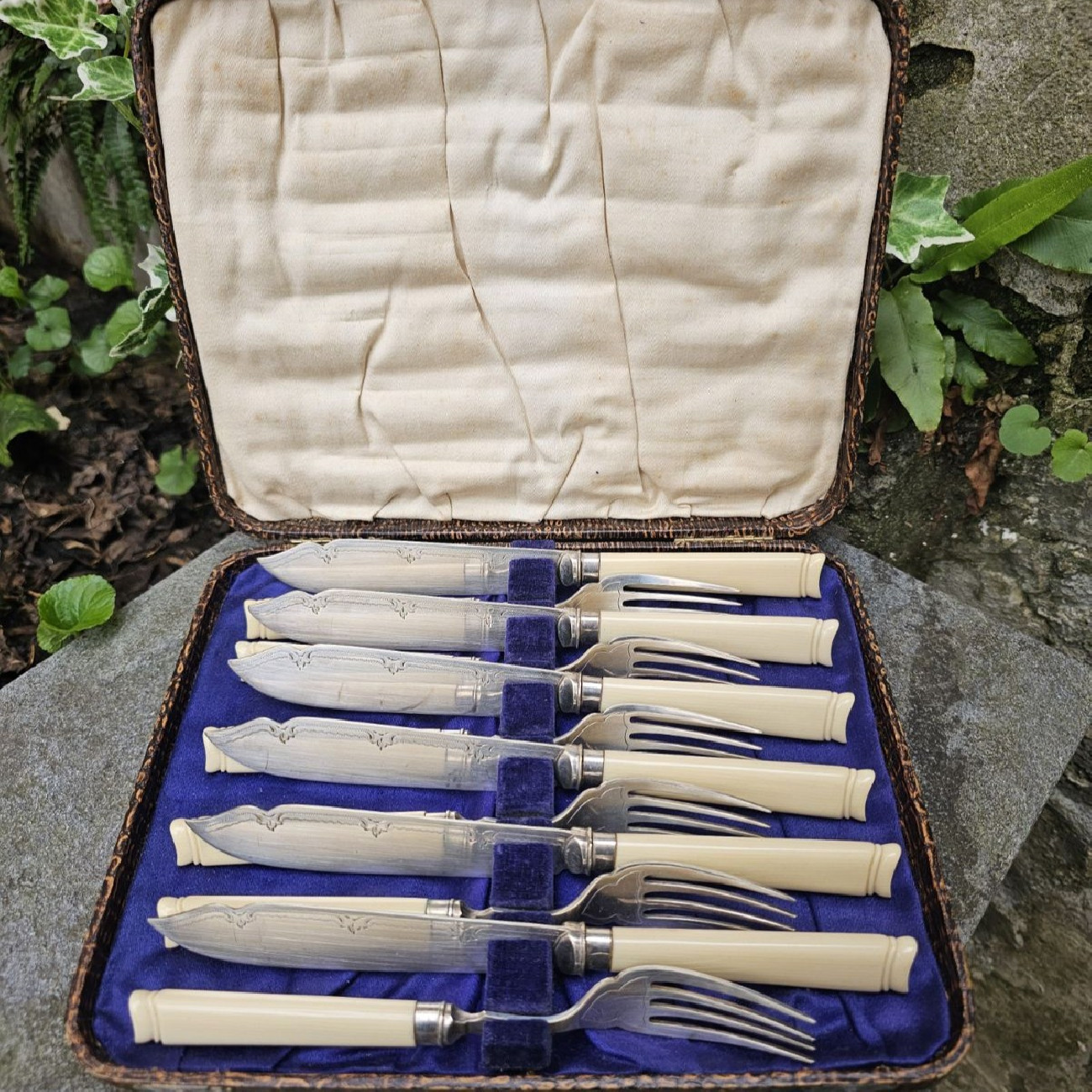 Il set è composto da 6 coltelli e 6 forchette da pesce, per un totale di 12 pezzi, alloggiati nell'astuccio originale con separatori in velluto blu e fodera interna in tessuto color crema.